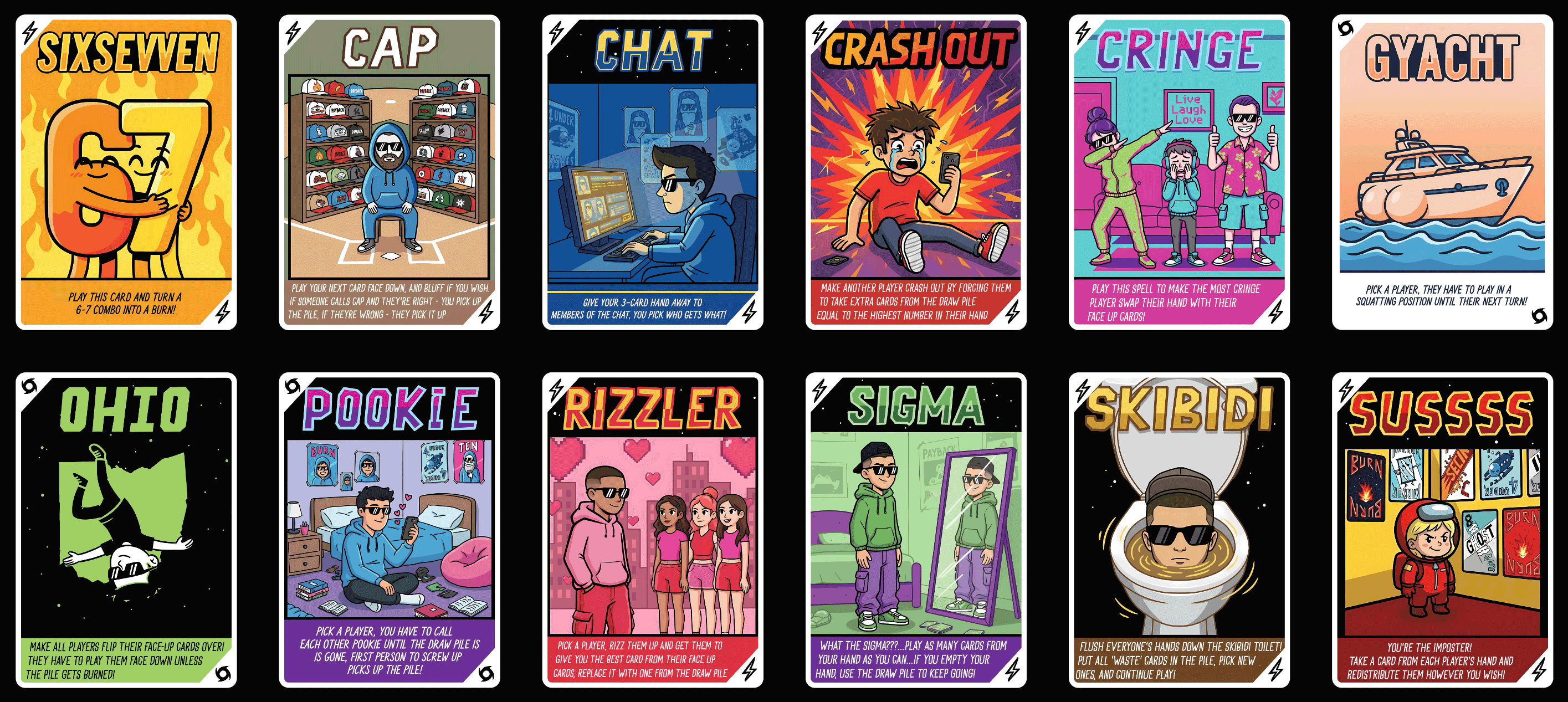 This is a gen-Z pack full of cards with brain rot references, such as 67, SKIBIDI, RIZZ, or GYACHT.